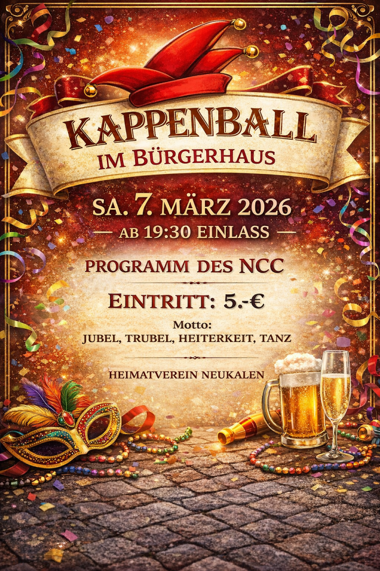 Der Kappenball blickt auf eine lange Tradition im Vereinsleben Neukalens zurĂŒck und wird regelmĂ€Ăig vom Heimatverein in enger Zusammenarbeit mit den Karnevalisten des NCC durchgefĂŒhrt.